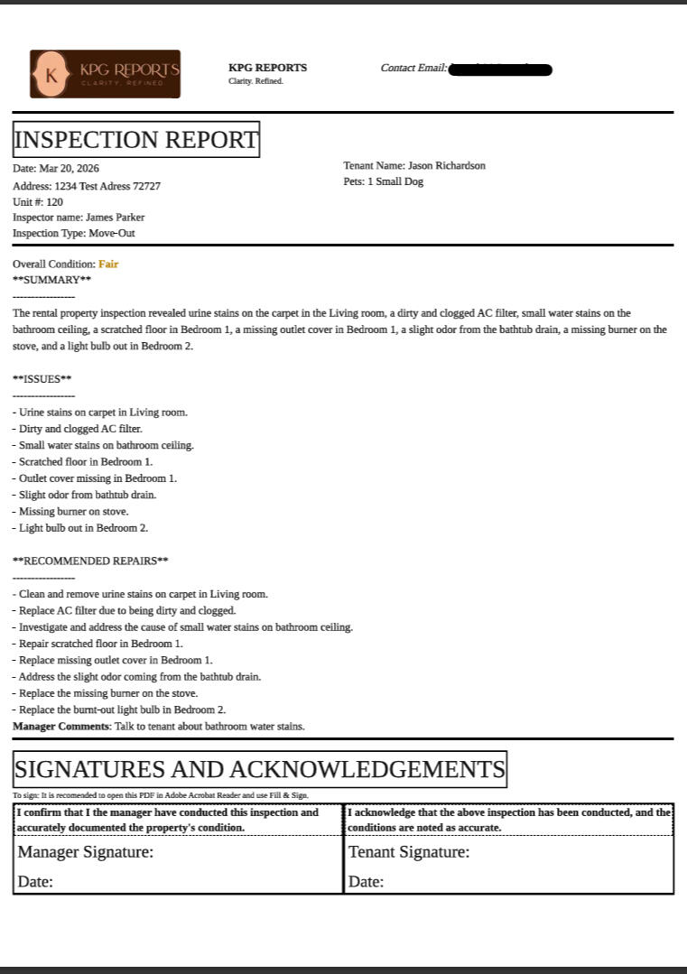 KPG Reports helps landlords and property managers create, manage, and store property inspection reports.Generate detailed AI inspection documentation, upload photos, and keep records organized in one place.