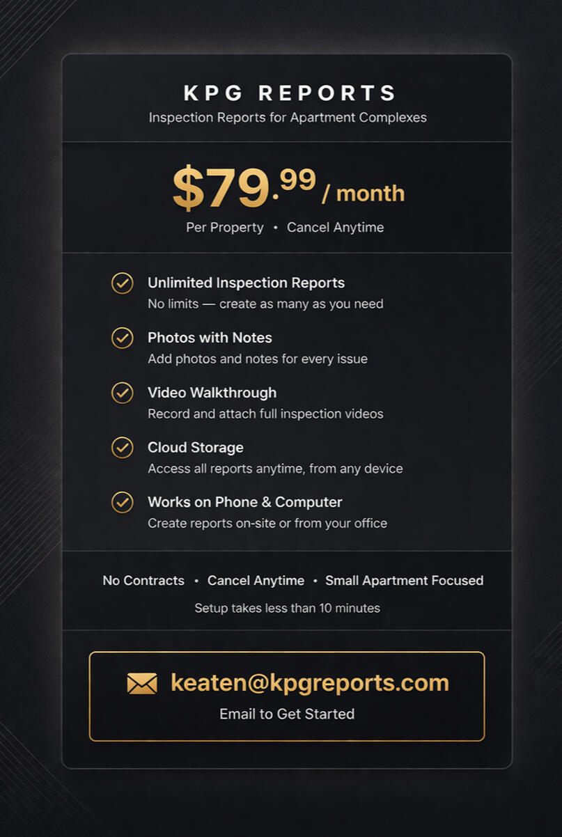 Built for apartment owners and property managers.$79 / month — Unlimited Reports, Photos, and Video Walkthroughs